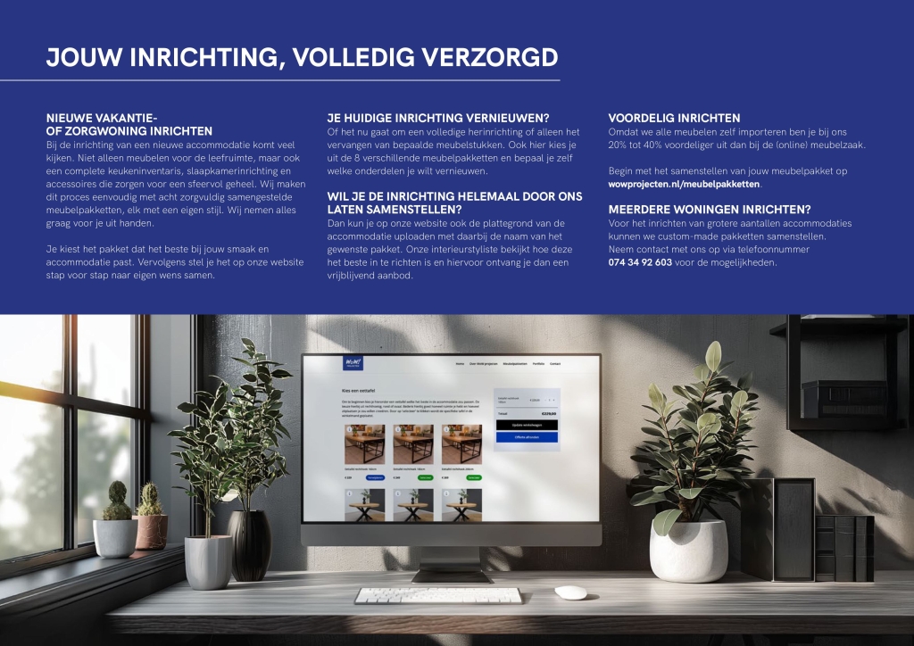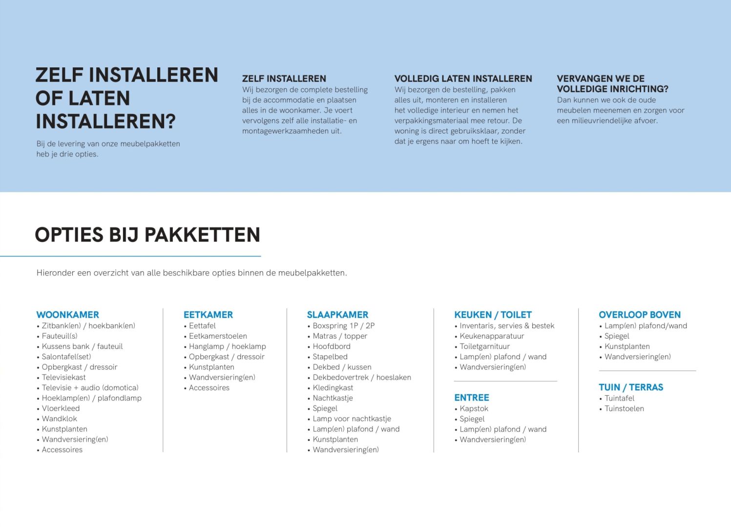 Hieronder het overzicht van onze meubelpakketten welke als complete inrichting aangeboden worden. Deze pakketten kunnen van A tot Z samengesteld worden binnen de wensen van de accommodatie. Klik hieronder op één van drie foto’s voor onze meubelpakketten brochure. Of kies hieronder direct je favoriete stijl uit en begin met samenstellen.