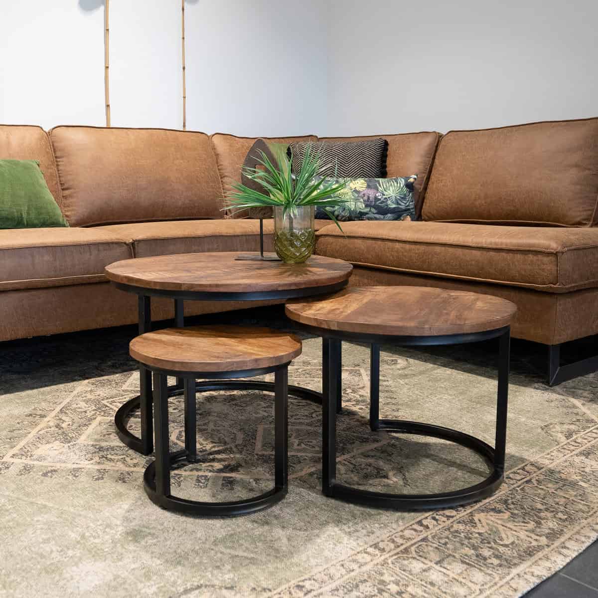 De salontafelssets hieronder bieden we aan als een compact model en daarnaast een wat groter model in de kleur naturel of zwart.